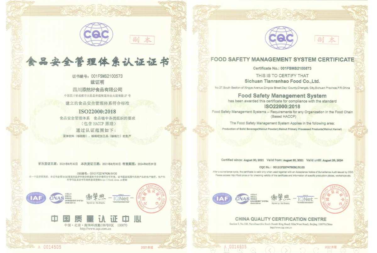 2021年8月30日,我們獲得了ISO9001和ISO22000雙體系認(rèn)證證書,此次認(rèn)證的順利通過,充分展示了公司全體員工的團(tuán)結(jié)一致,為共同目標(biāo)不斷努力,勇往直前的精神面貌。在今后的工作中,我們也會一如既往地嚴(yán)格執(zhí)行管理體系要求,持續(xù)改進(jìn)!更優(yōu)質(zhì)的為客戶服務(wù)!